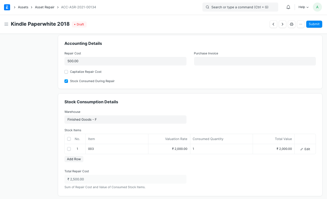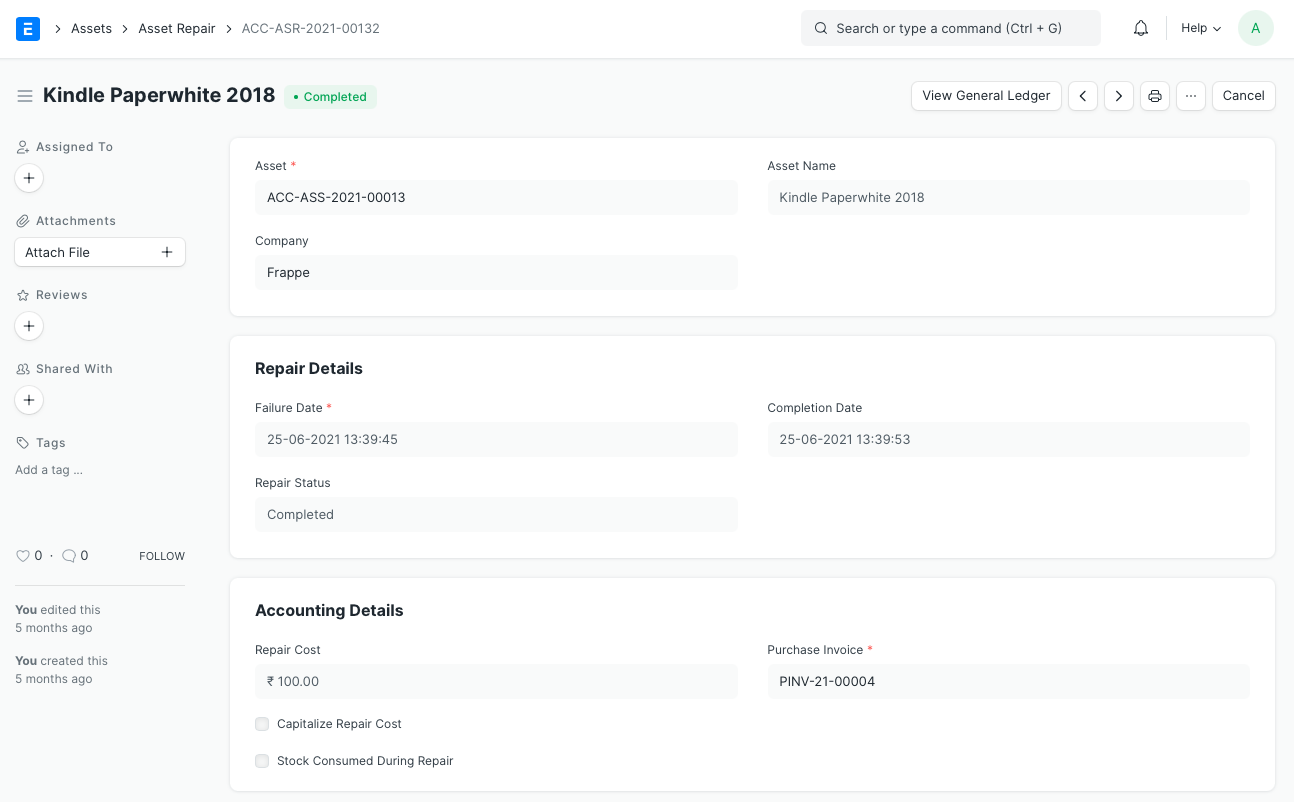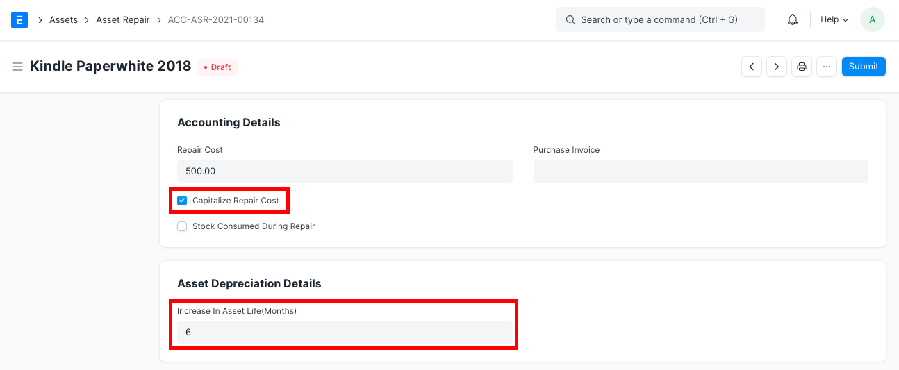 • Tăng Tuổi thọ của Tài sản (Tháng) : Có thể thêm số tháng mà Tuổi thọ của Tài sản có thể được kéo dài khi sửa chữa có thể được thêm vào đây. Điều này sẽ sửa đổi Lịch trình khấu hao của Tài sản. Trường này sẽ chỉ hiển thị nếu chọn Viết hoa Chi phí Sửa chữa.
