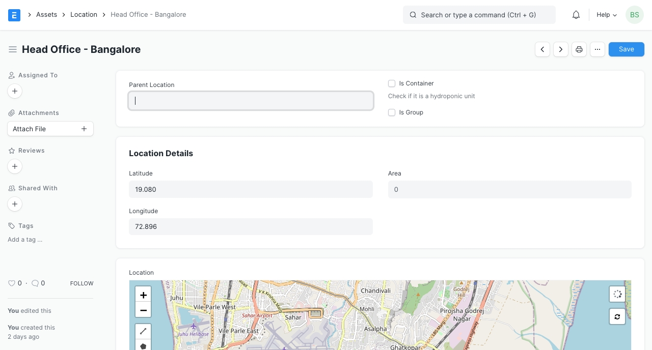 Bạn cũng có thể thêm Vĩ độ và Kinh độ của vị trí. Khi tài sản được di chuyển từ vị trí này sang vị trí khác, bạn cần tạo bản ghi Di chuyển tài sản.