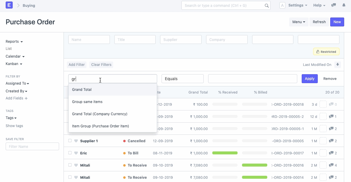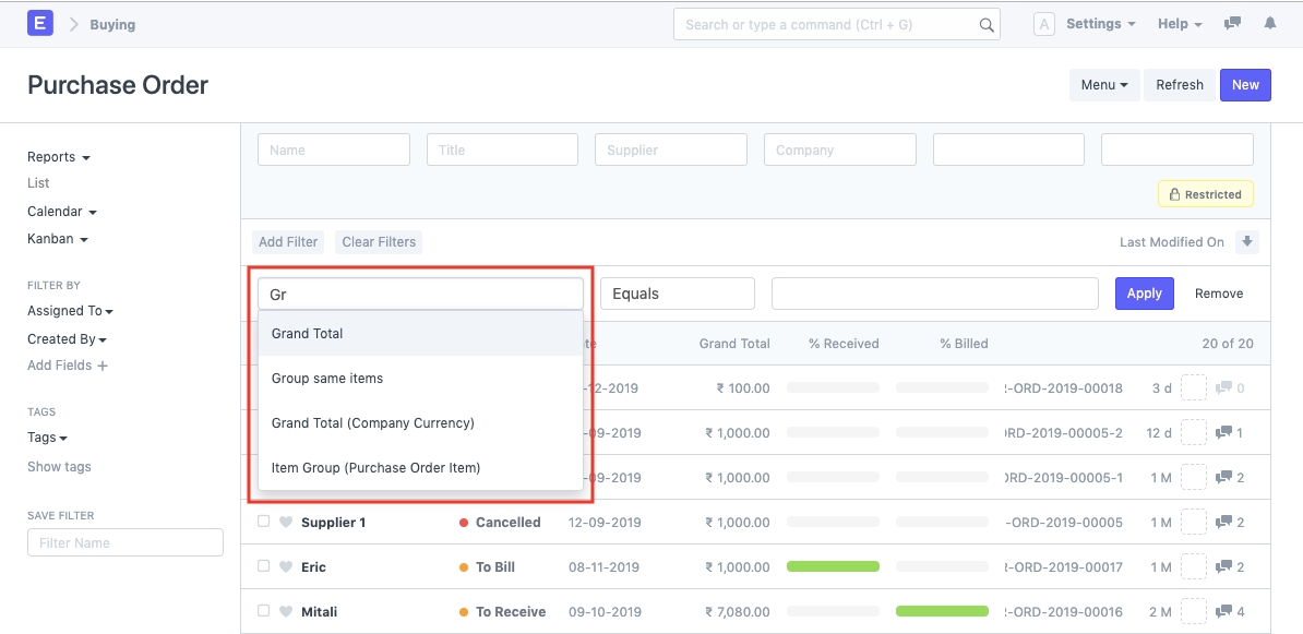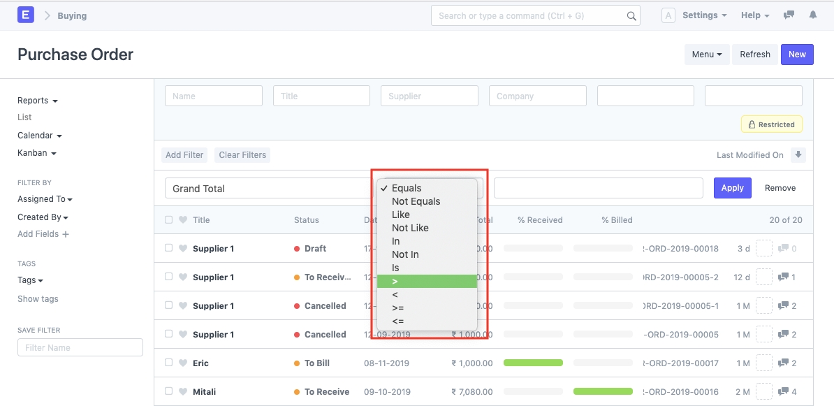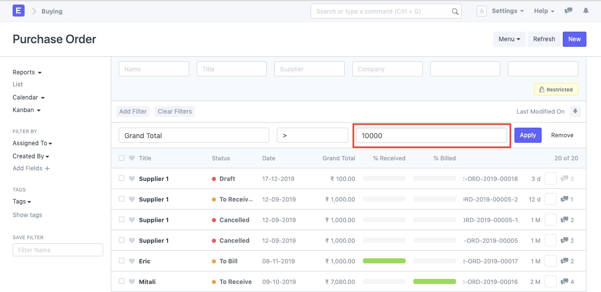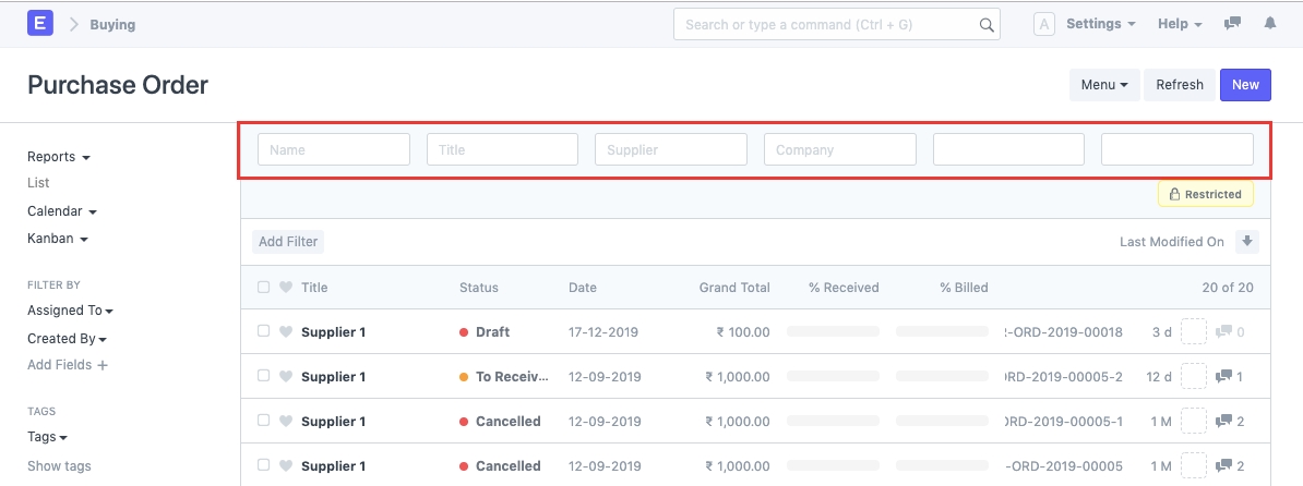 Bộ lọc Tìm kiếm là một tùy chọn cho phép bạn lọc các bản ghi dựa trên một giá trị cụ thể của một trường cụ thể trong Tài liệu.