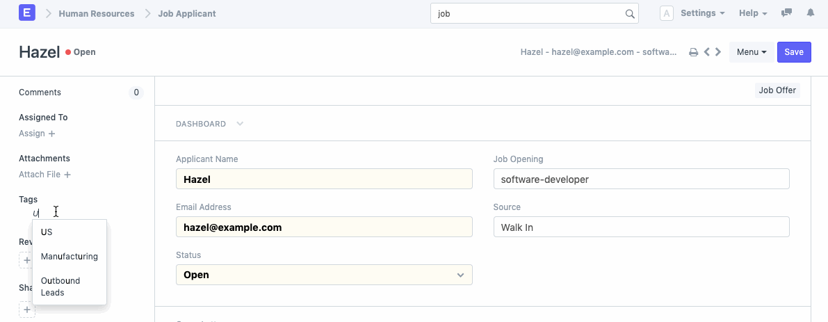 Bạn có thể thêm bất kỳ thẻ nào vào DocType giống như mục Giao việc và Nhận xét.