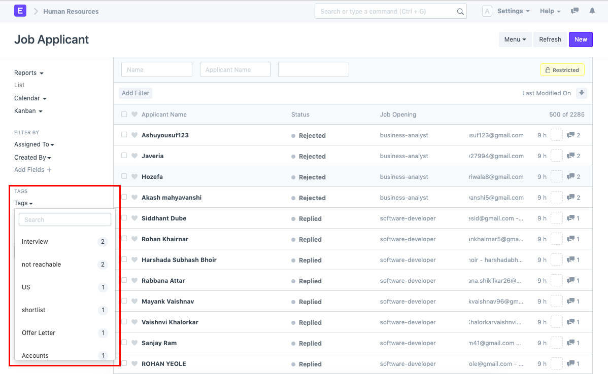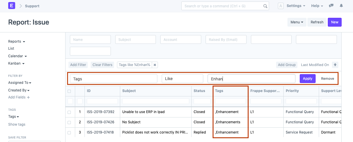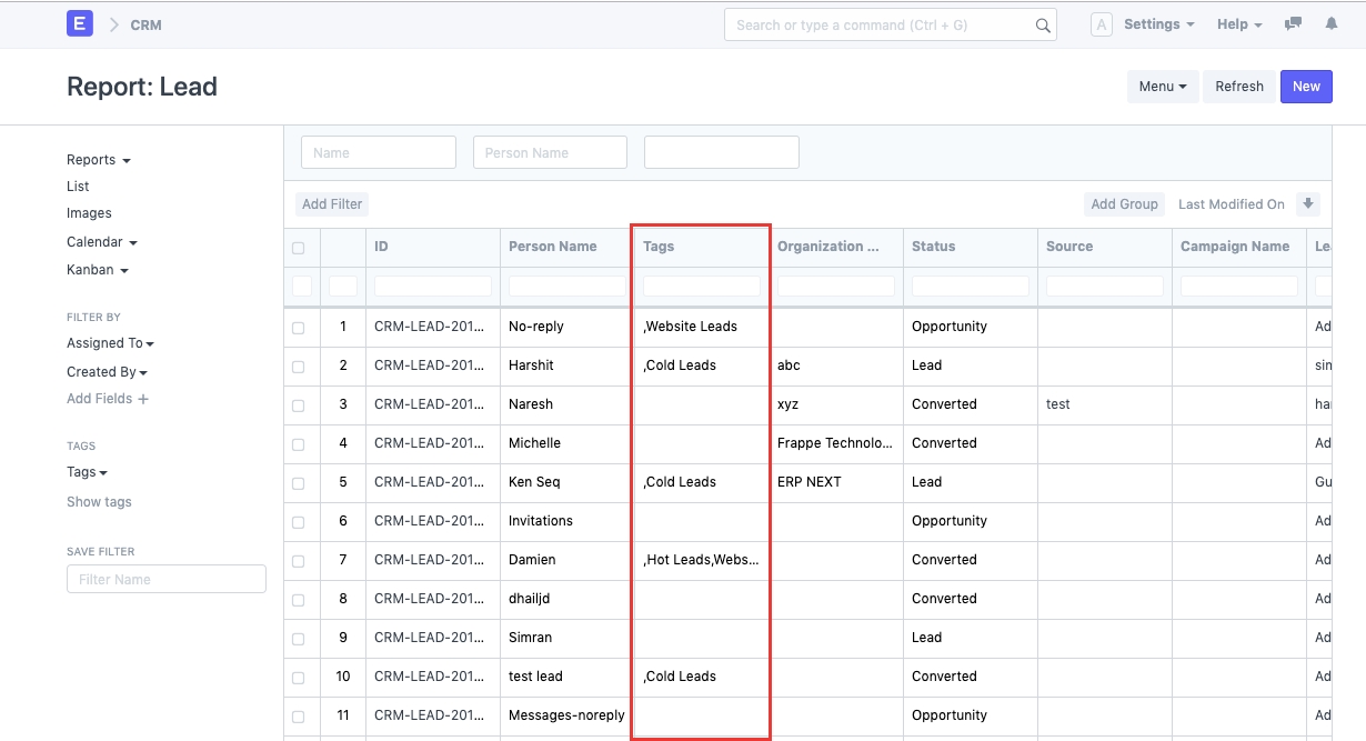 Tất cả các thẻ được tạo trong tài khoản CRM của bạn cũng có thể được tìm kiếm khi tìm nạp báo cáo. Các thẻ này cũng có thể được tìm kiếm như một bộ lọc trong báo cáo.
