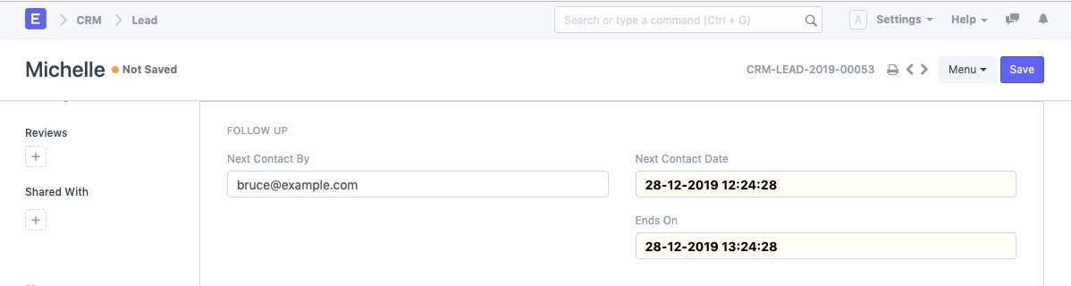 Trong biểu mẫu Khách hàng tiềm năng, bạn sẽ tìm thấy một trường có tên là Next Contact By và Next Contact Date. Khi bạn chỉ định ngày và Người dùng trong các trường này, một sự kiện sẽ tự động được tạo cho Người dùng vào ngày và giờ nhất định.