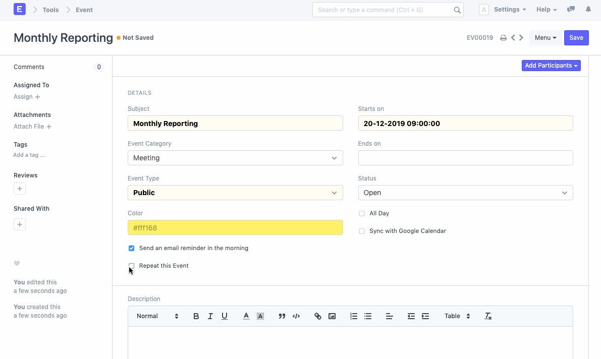 Có nhiều sự kiện khác nhau trong một tổ chức diễn ra thường xuyên theo các khoảng thời gian định kỳ. Trong CRM, bạn có thể tạo các sự kiện như vậy bằng cách bật tính năng 'Lặp lại sự kiện' cho sự kiện cụ thể đó.