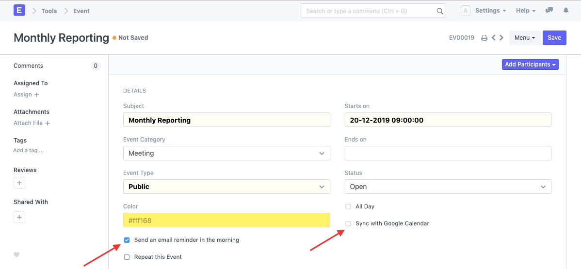 Trong phần tổng thể Sự kiện, chọn "Gửi lời nhắc qua email vào buổi sáng" sẽ kích hoạt một email thông báo tới tất cả những người tham gia sự kiện này.