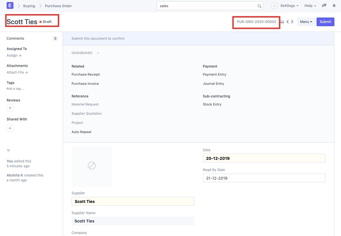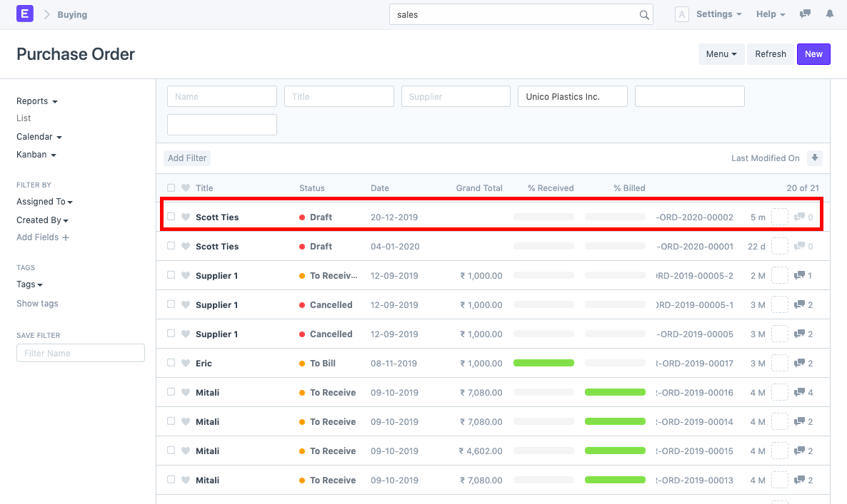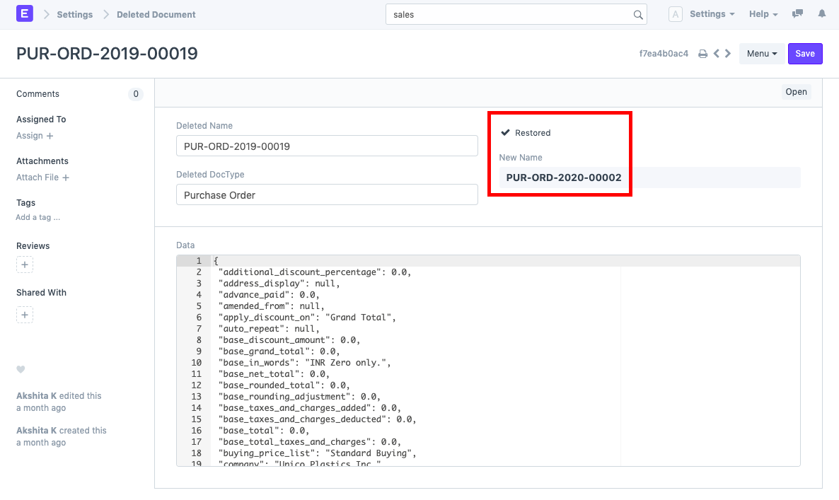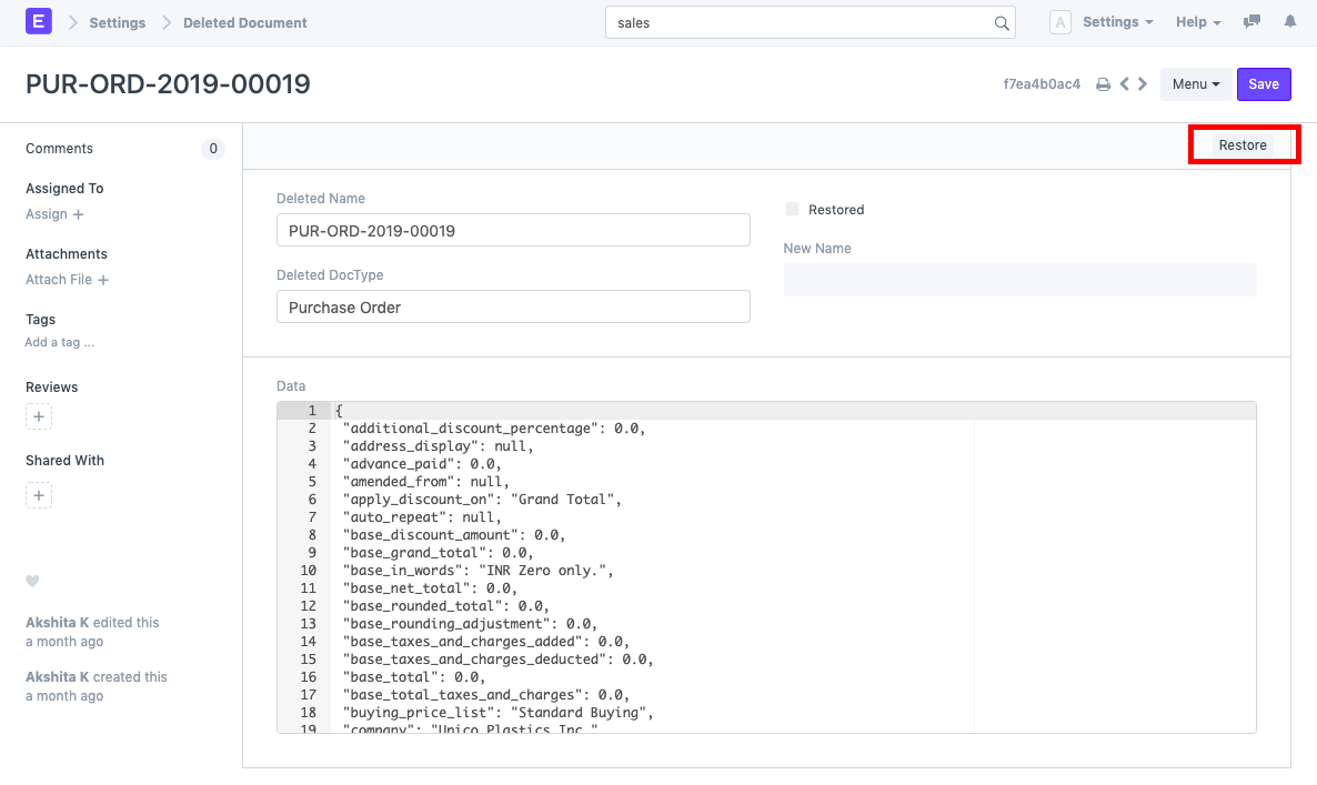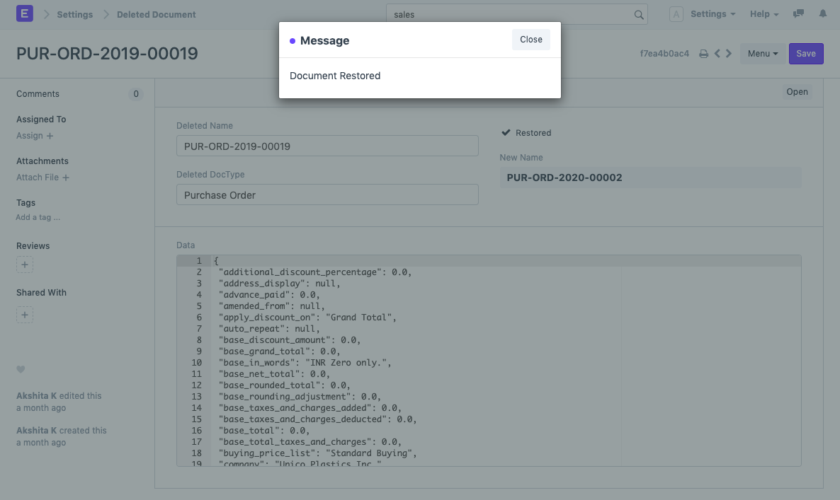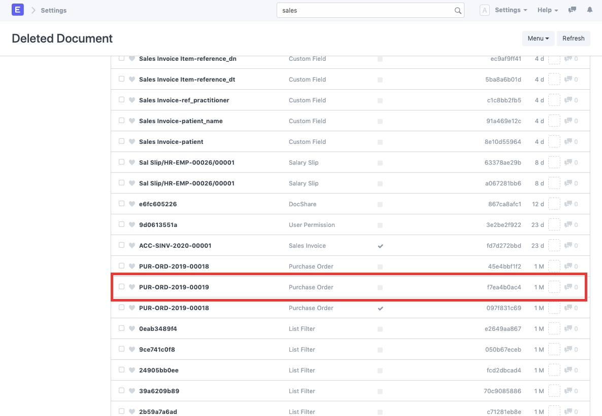 Trường hợp sử dụng: Cần khôi phục / lấy lại các tài liệu đã bị xóa. Các bước: 1) Đi tới Cài đặt> Tài liệu đã Xóa (hoặc tìm kiếm "Danh sách tài liệu đã xóa" trong thanh tìm kiếm). 2) Tìm kiếm tài liệu đã xóa. Bạn cũng có thể lọc ra tài liệu dựa trên DocType đã xóa. Ví dụ: chúng tôi cần khôi phục Đơn đặt hàng, PUR-ORD-2019-00019. Để làm như vậy, hãy tìm kiếm tài liệu tương tự trong danh sách tài liệu đã xóa và mở nó.