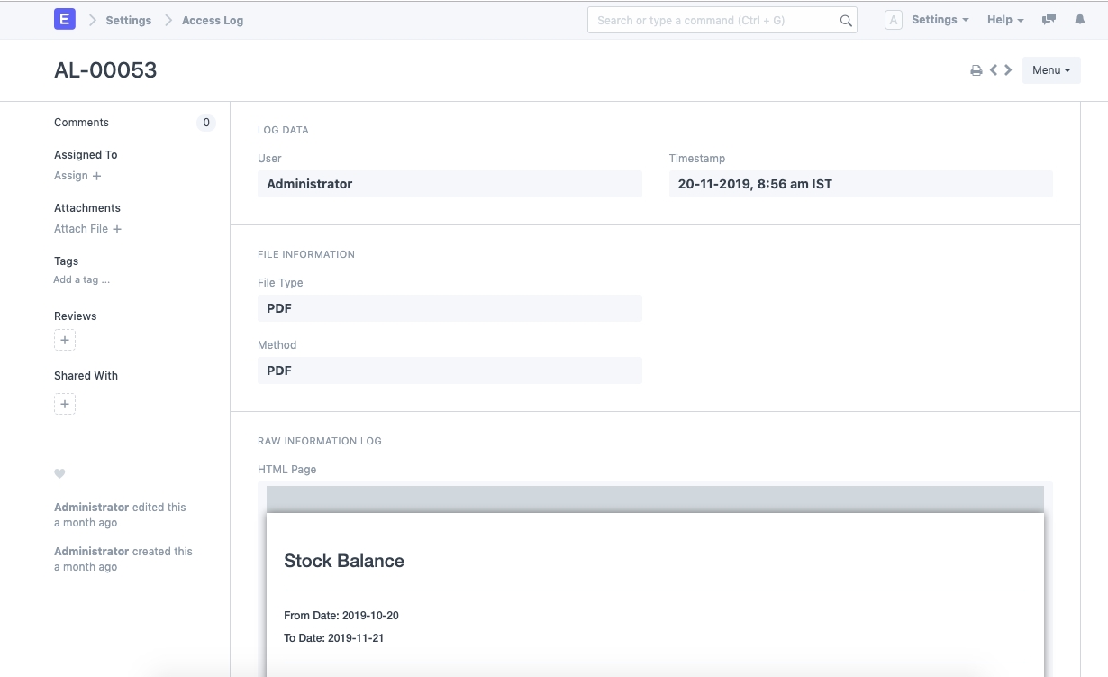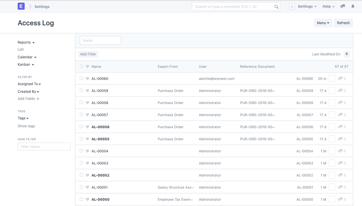 Trong ERPNext, Nhật ký truy cập có sẵn cho Người quản lý hệ thống, nó có thể được truy cập bằng Tìm kiếm chung hoặc thông qua: