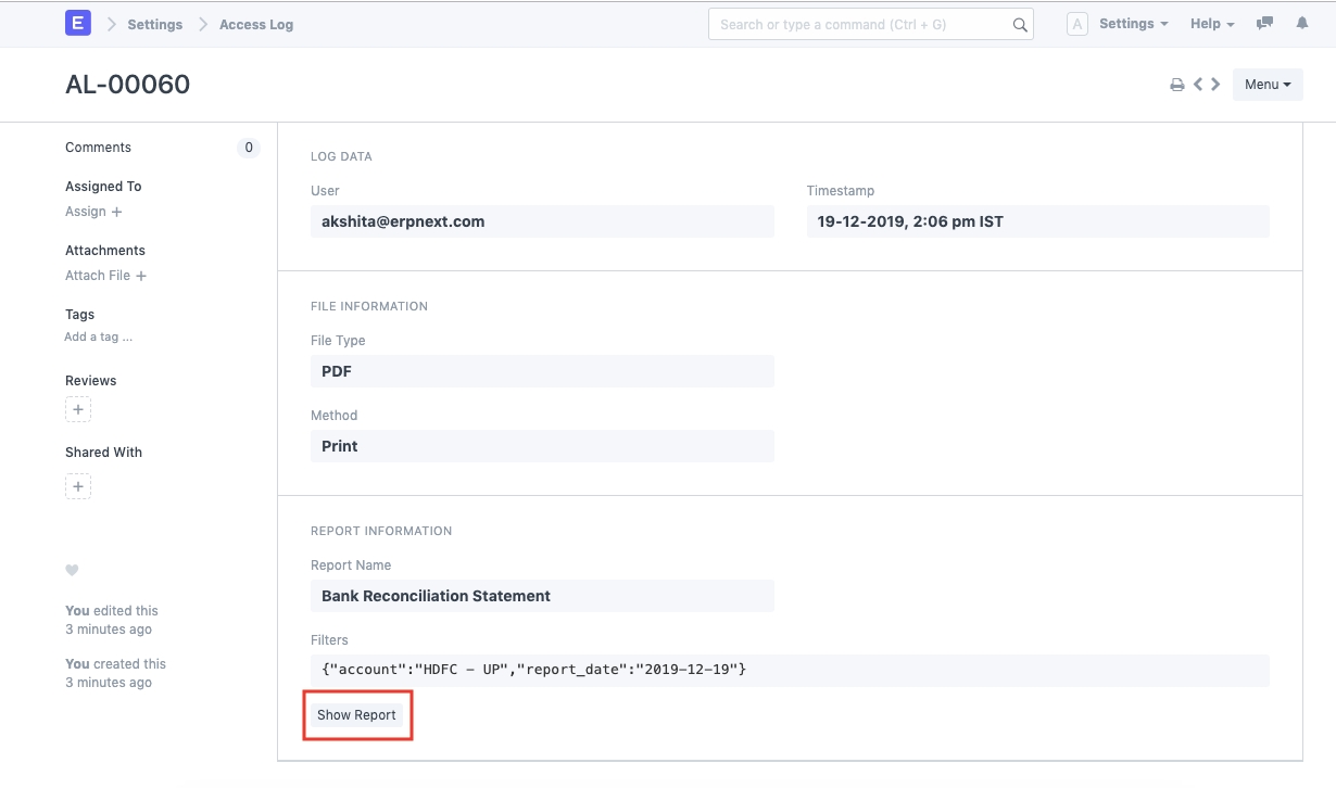 Trong trường hợp nhật ký truy cập được tạo trong trường hợp xuất Báo cáo, nút Hiển thị Báo cáo sẽ được tạo trong nhật ký tương ứng. Khi nhấp vào nút này, báo cáo đã xuất có thể được xem cùng với các bộ lọc đã đặt.