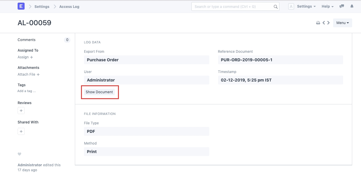 Tương tự, nút Hiển thị Tài liệu được tạo trong trường hợp các sự kiện liên quan trực tiếp đến tài liệu, chẳng hạn như In tài liệu và tải xuống Tệp Riêng tư.
