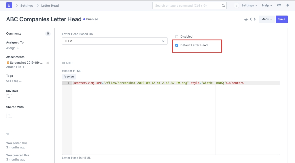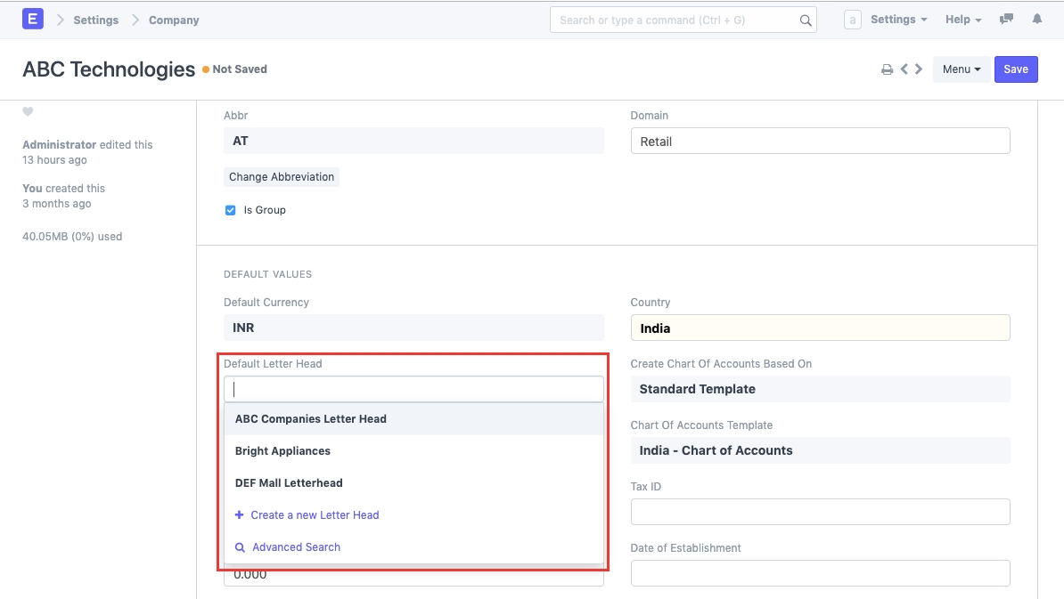 Nếu bạn đang quản lý nhiều công ty trong một tài khoản ERPNext, thì hãy đảm bảo rằng đối với mỗi Công ty, Tiêu đề Thư mặc định được đặt trong Công ty chính.