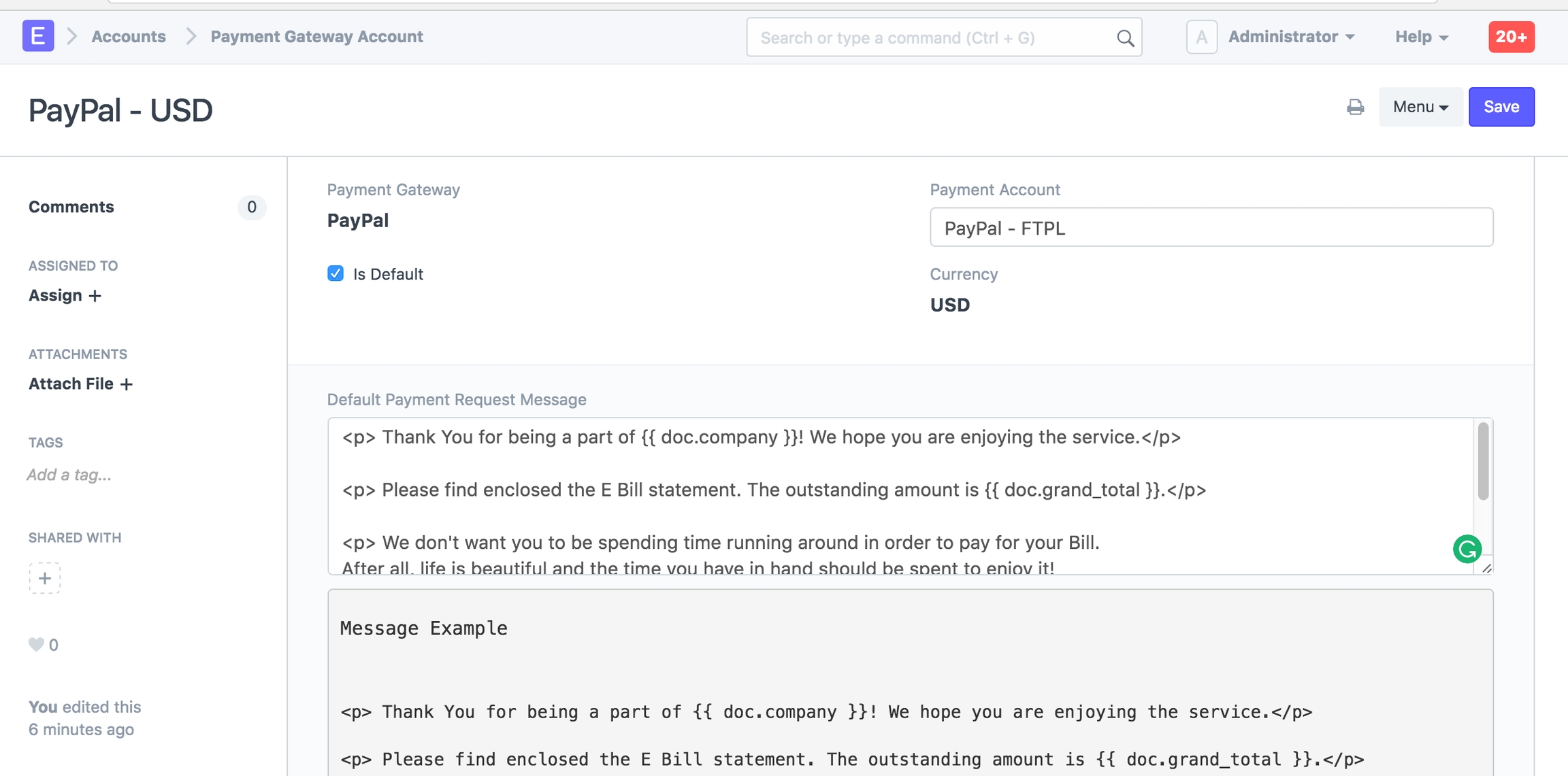 Ngoài ra, nó sẽ tạo mục nhập Tài khoản Cổng thanh toán. Tài khoản Cổng thanh toán là trung tâm cấu hình, từ đó bạn có thể đặt người đứng đầu tài khoản từ COA hiện có, mẫu nội dung email Yêu cầu thanh toán mặc định.