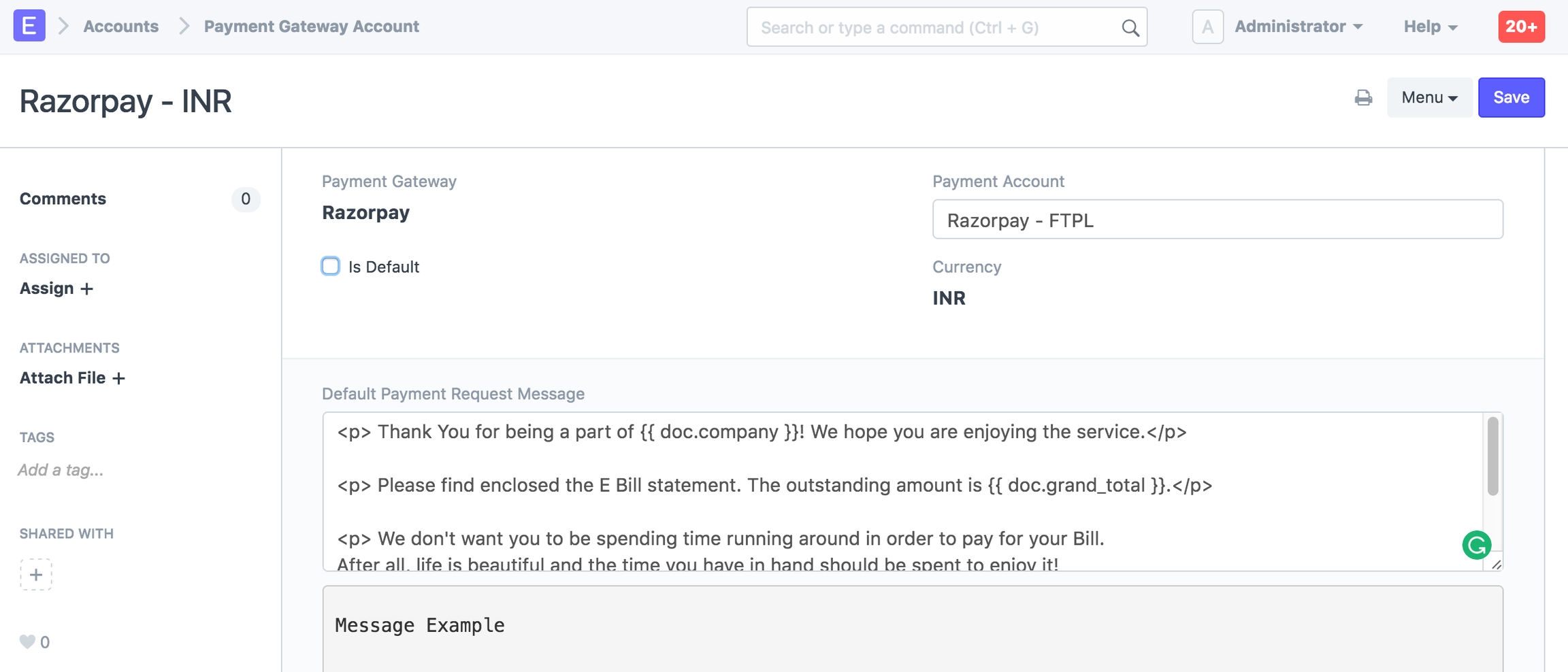 Ngoài ra, nó sẽ tạo mục nhập Tài khoản Cổng thanh toán. Tài khoản Cổng thanh toán là trung tâm cấu hình, từ đó bạn có thể đặt người đứng đầu tài khoản từ COA hiện có, mẫu nội dung email Yêu cầu thanh toán mặc định.