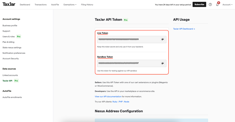 Bạn sẽ cần mã thông báo API từ tài khoản của mình để thiết lập Taxjar.