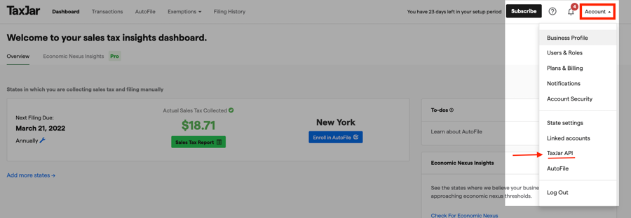 2. Đăng nhập vào trang tổng quan tài khoản của bạn và nhấp vào nút Tài khoản và nhấp vào API TaxJar trong danh sách tùy chọn thả xuống.