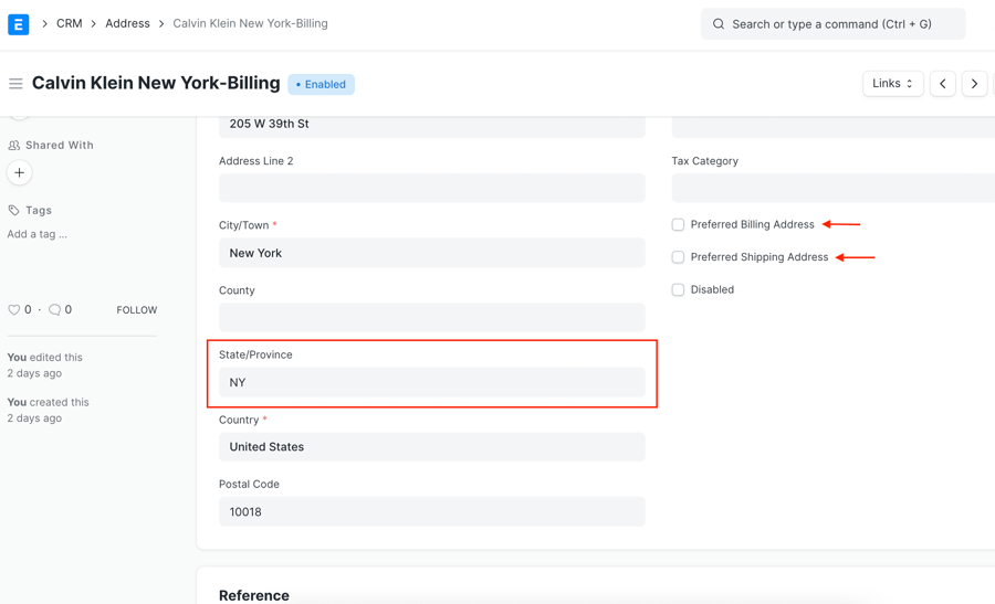 1. Trong khi tạo địa chỉ, hãy đảm bảo rằng trong trường Bang / Tỉnh, bạn nhập đúng trạng thái. TaxJar yêu cầu định dạng 2 chữ cái cho các tiểu bang cho ví dụ. New York được coi là NY, nhưng không cần nhập bắt buộc theo cách đó, hệ thống sẽ tự động chuyển đổi thành mã tiểu bang gồm 2 chữ cái.