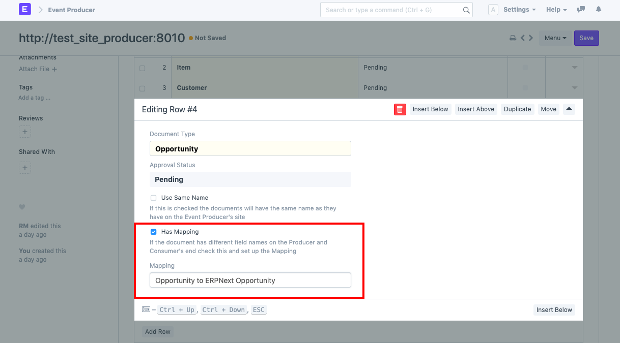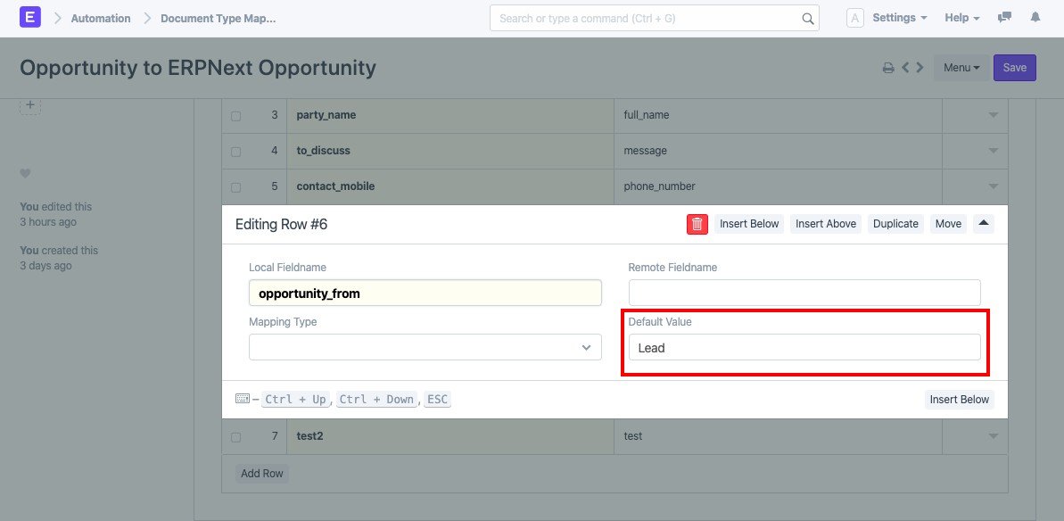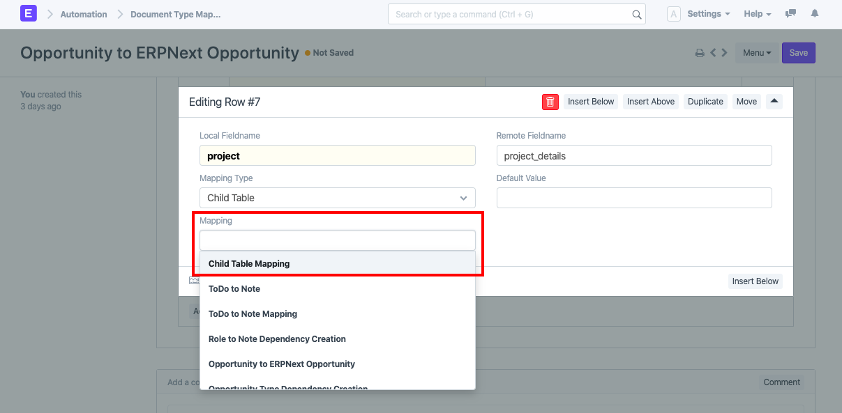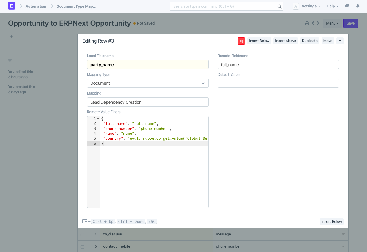 Ví dụ: giả sử rằng loại tài liệu cục bộ là Cơ hội và loại tài liệu từ xa là Cơ hội văn bản ERPN. Trường party_name(Trường liên kết cho Khách hàng tiềm năng DocType) trong Cơ hội được ánh xạ tới full_name(Trường dữ liệu) trong Cơ hội văn bản ERPN. Trong quá trình đồng bộ hóa, Khách hàng tiềm năng này phải được tạo cho Cơ hội chính để đồng bộ hóa. Vì vậy, bạn cũng cần thiết lập ánh xạ cho Trường liên kết này.