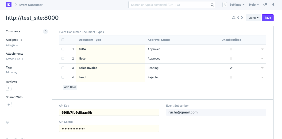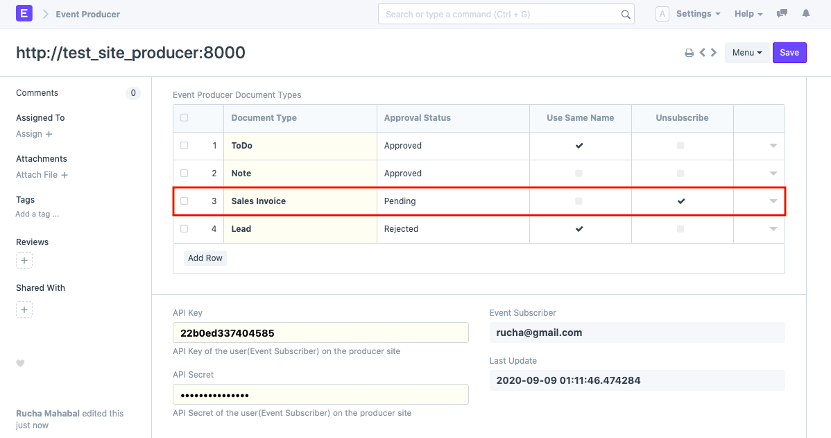 Trước khi tạo Nhà sản xuất sự kiện, một người dùng thông thường cần được tạo trên cả hai trang web sẽ được sử dụng để truy cập trang web và sẽ hoạt động như một Người đăng ký sự kiện. Đảm bảo rằng người dùng là Người quản lý hệ thống và có các quyền cần thiết để tạo, cập nhật và xóa các DocTypes đã đăng ký.