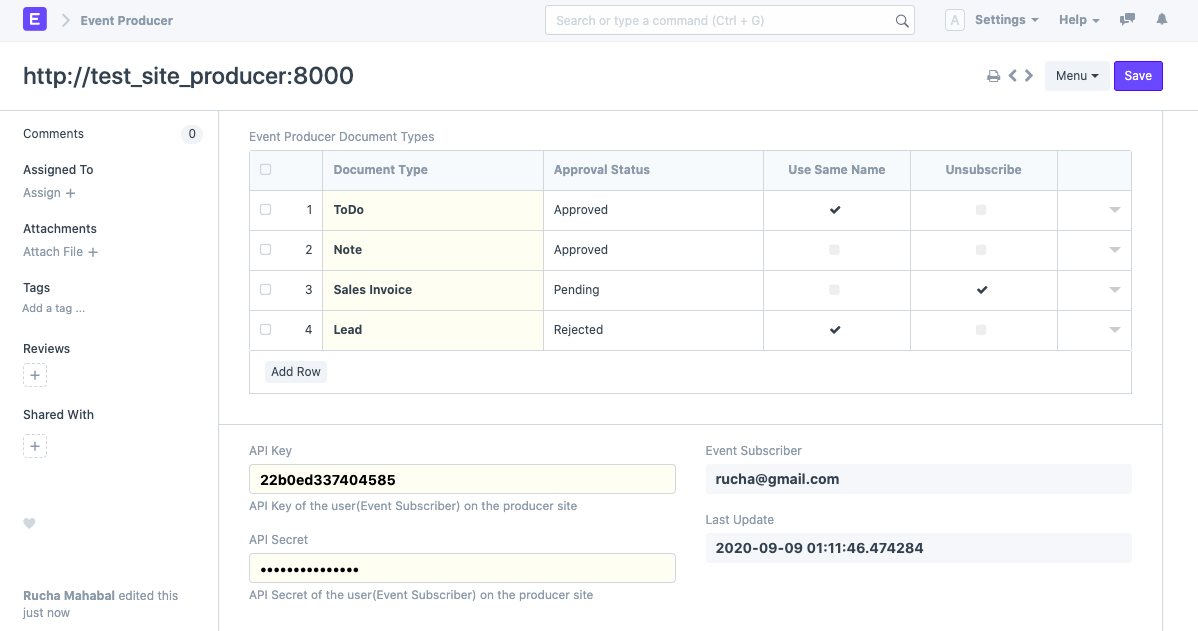 Đặt trường Người đăng ký sự kiện thành người dùng sẽ được sử dụng để tạo tài liệu được tải xuống từ Nhà sản xuất sự kiện. Bạn cần tạo cùng một người dùng theo cả hai cách, tức là trên Người tiêu dùng sự kiện cũng như trang Nhà sản xuất sự kiện trước khi tạo Nhà sản xuất sự kiện.
