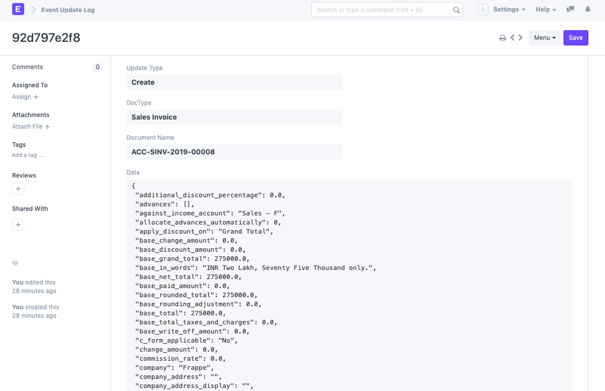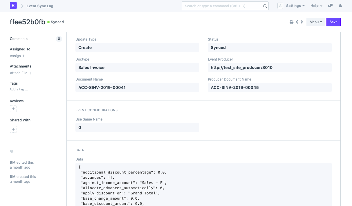 Hãy xem xét một ví dụ khác. Bạn chỉ muốn đồng bộ hóa những Hóa đơn bán hàng đã được gửi. Bạn có thể chỉ định doc.docstatus == 1làm điều kiện. Các hóa đơn sẽ không được đồng bộ hóa cho đến khi chúng được gửi.