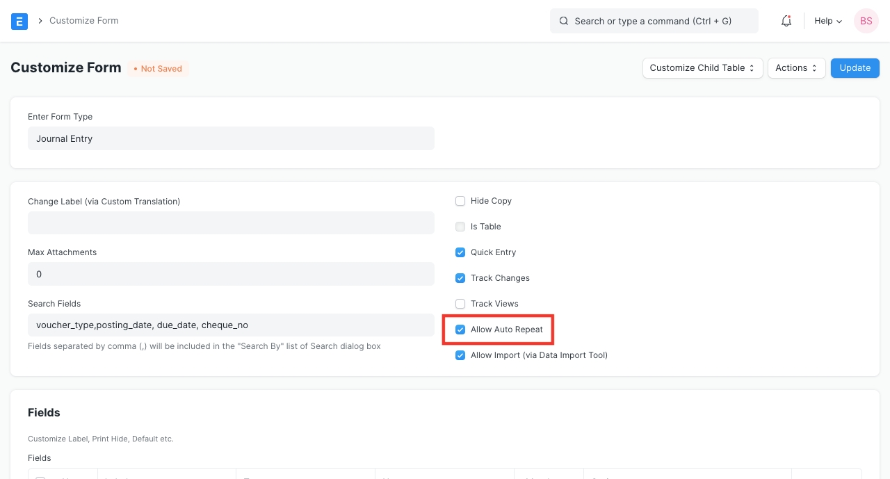 Chọn 'Cho phép tự động lặp lại' để cho phép tạo các tài liệu có thể lặp lại cho Biểu mẫu đó. Điều này là cần thiết để loại tài liệu hiển thị trong trường Tài liệu tham khảo trong loại tài liệu Tự động lặp lại.