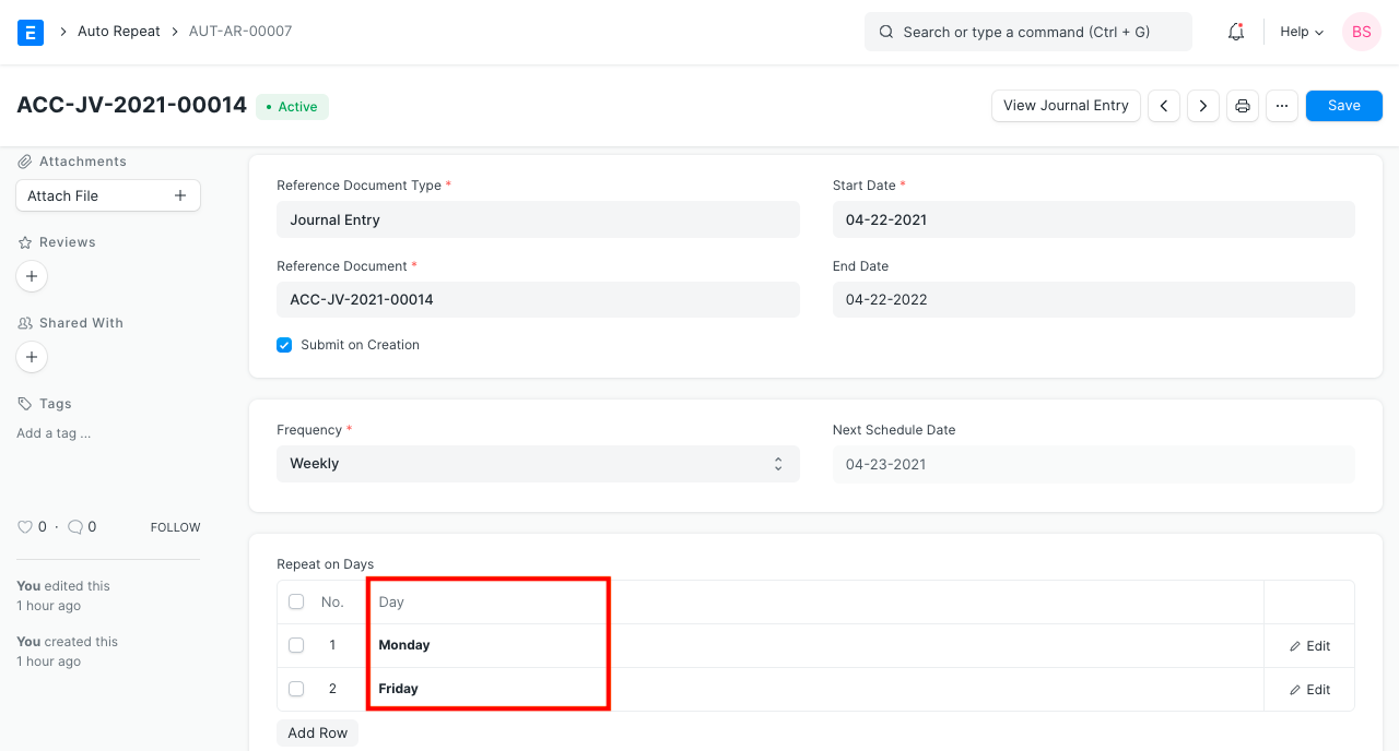 Lặp lại vào Ngày : Ngày trong tháng mà tài liệu lặp lại sẽ được tạo. Ví dụ: nếu tần suất là Hàng tháng và bạn nhập 7 thì nó sẽ tạo tài liệu định kỳ vào ngày 7 của tháng tương ứng.