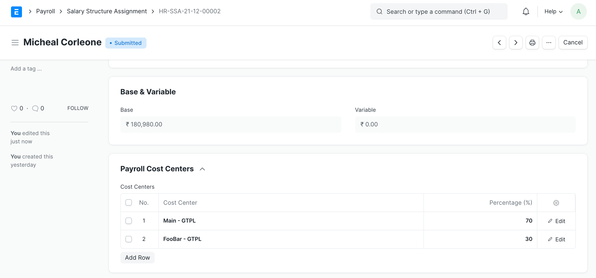 Thậm chí nhiều trung tâm chi phí có thể được chỉ định cho một Nhân viên duy nhất, bạn có thể làm như vậy thông qua tài liệu Phân công Cơ cấu Tiền lương.