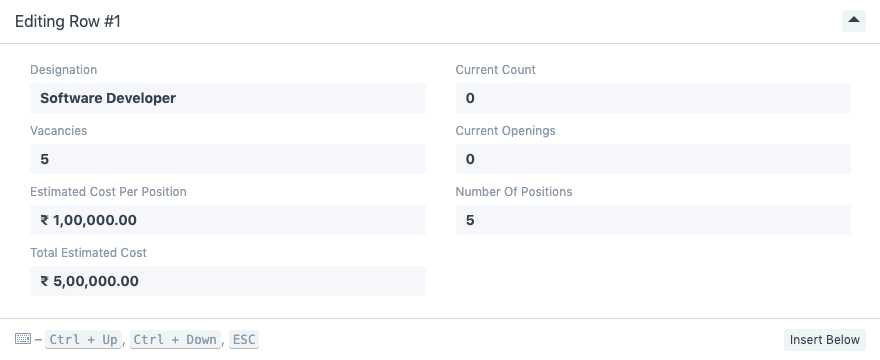 Nhập Chi tiết kế hoạch nhân sự như Chỉ định, Vị trí tuyển dụng, Chi phí ước tính cho mỗi vị trí, Tổng chi phí ước tính và Số lượng vị trí.