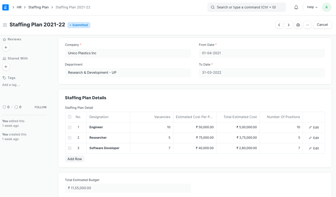 ERPNext cho phép bạn thực hiện điều này ở cấp công ty, giúp bạn lập kế hoạch và lập ngân sách một cách hiệu quả cho các gợi ý mới trong một khoảng thời gian. Chỉ có thể tạo Cơ hội việc làm theo số lượng vị trí tuyển dụng và ngân sách theo Kế hoạch Nhân sự đang hoạt động.