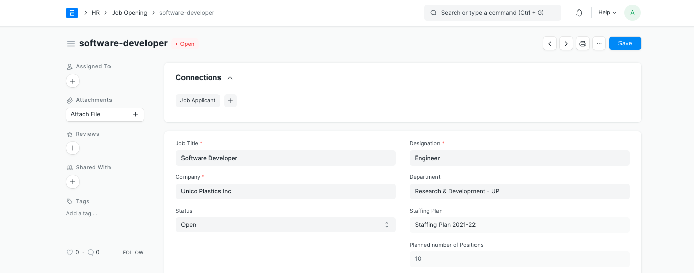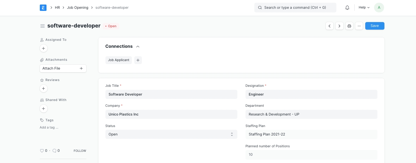 ERPNext cho phép lập kế hoạch tuyển dụng cho công ty của bạn. Số lượng Cơ hội việc làm bạn có thể tạo cho một Chức vụ bị hạn chế theo các vị trí tuyển dụng được lên kế hoạch bởi Kế hoạch Nhân sự được xác định cho công ty hoặc một trong các công ty thuộc tập đoàn mẹ của nó trong hệ thống phân cấp.