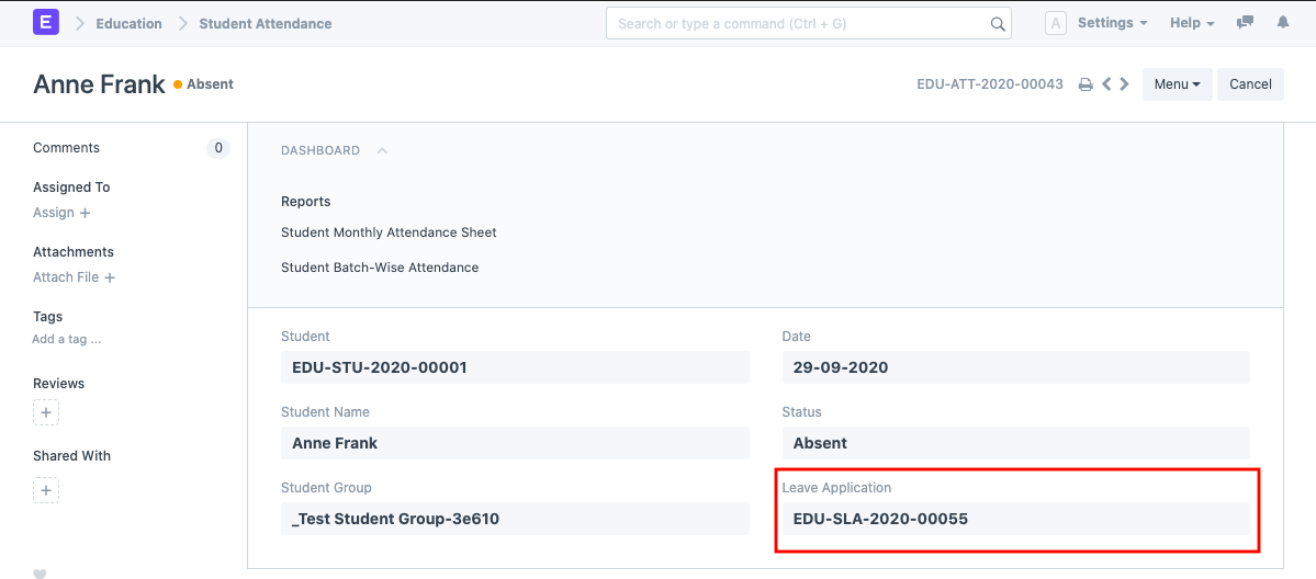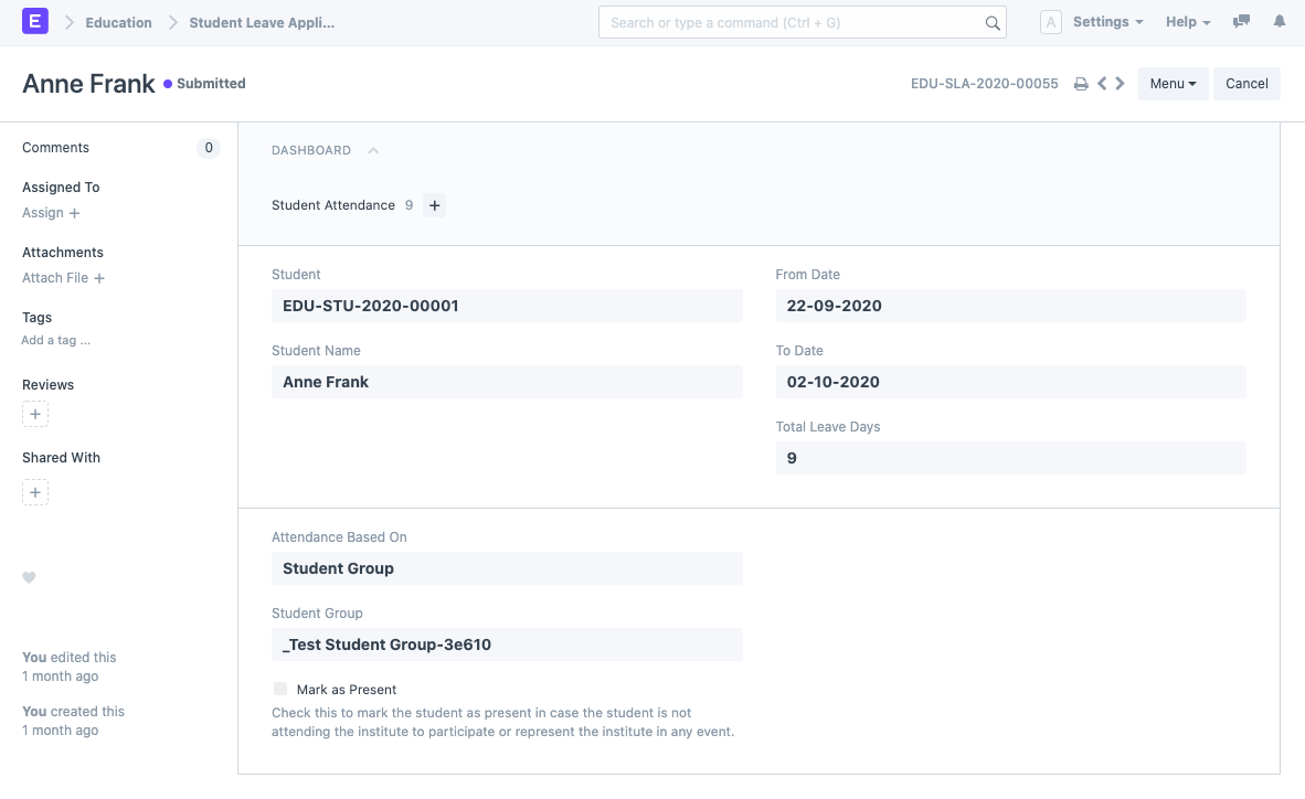 Sau khi Đơn xin Nghỉ học của Sinh viên được gửi, một bản ghi Chuyên cần của Sinh viên sẽ tự động được tạo với trạng thái là 'Vắng mặt'. Nếu Đánh dấu là Có mặt được chọn, thì trạng thái của Bản ghi Điểm danh được đặt là 'Có mặt'. Đơn Xin Nghỉ Phép được liên kết với tài liệu Điểm Danh Học Viên này để tham khảo.