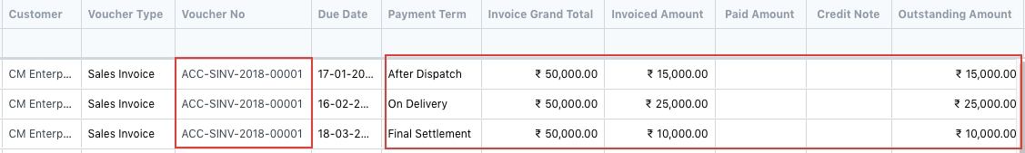Có thể thấy số tiền chưa thanh toán theo từng kỳ hạn thanh toán. Số tiền được Lập hóa đơn hiển thị số tiền theo thời hạn thanh toán và Số tiền đã thanh toán hiển thị số tiền đã thanh toán theo từng thời hạn thanh toán. Thanh toán theo từng kỳ hạn được phân bổ theo thứ tự FIFO.