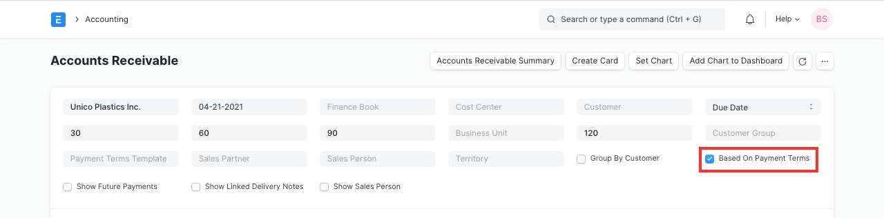 Báo cáo Tài khoản Phải thu dựa trên các điều khoản thanh toán có thể được xem bằng cách nhấp vào hộp kiểm 'Dựa trên Điều khoản Thanh toán' như được hiển thị trong ảnh chụp màn hình sau.