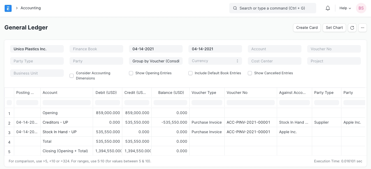 Báo cáo dựa trên Mục nhập bảng GL và có thể được lọc bằng nhiều bộ lọc được xác định trước như Tài khoản, Trung tâm chi phí, Bên, Dự án và Thời kỳ, v.v. Điều này giúp bạn nhận được cập nhật đầy đủ cho tất cả các mục được đăng trong một khoảng thời gian so với bất kỳ tài khoản nào. . Kết quả có thể được nhóm theo Tài khoản, Chứng từ / Giao dịch và Bên với số dư đầu kỳ và cuối kỳ cho mỗi nhóm. Trong trường hợp hạch toán nhiều đơn vị tiền tệ, cũng có một tùy chọn để kiểm tra số tiền bằng bất kỳ đơn vị tiền tệ nào khác với đơn vị tiền tệ cơ bản của công ty.