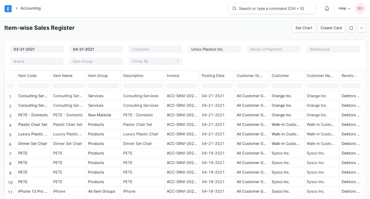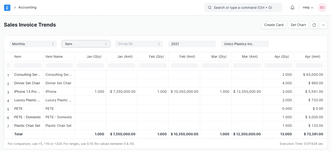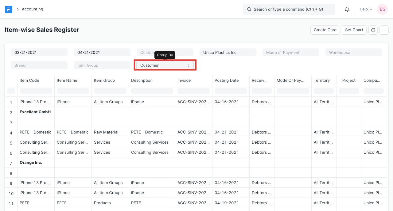 Phân tích chi tiết hơn cũng có thể được thực hiện bằng cách sử dụng bộ lọc 'Nhóm theo' cung cấp dữ liệu bán hàng cho một Khách hàng, Nhà cung cấp, Lãnh thổ cụ thể, v.v. Bạn có thể tìm ra Mặt hàng nào phổ biến hơn ở khu vực nào hoặc Khách hàng đang mua Mặt hàng nào hơn .