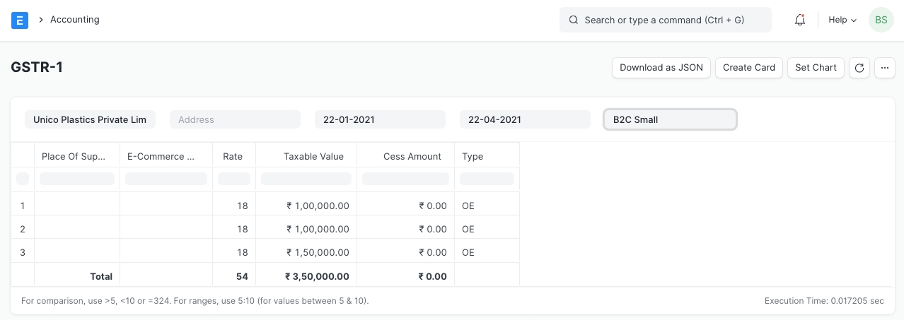 Báo cáo GSTR-1 giúp người dùng Ấn Độ lập hồ sơ trả lại hàng tháng của các nguồn cung cấp bên ngoài. Báo cáo này hiển thị tất cả các giao dịch bán hàng của công ty ở định dạng do Chính phủ quy định. Đầu ra của báo cáo được thay đổi dựa trên loại hình kinh doanh đã chọn (B2B, B2C Lớn, B2C Nhỏ, CDNR và Xuất khẩu).