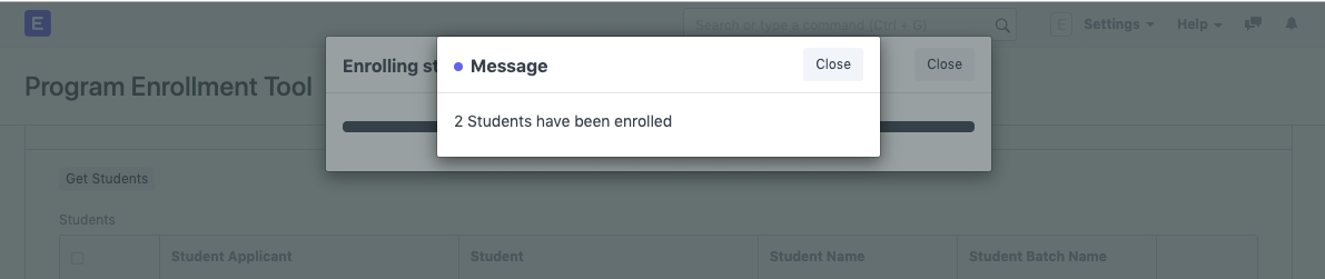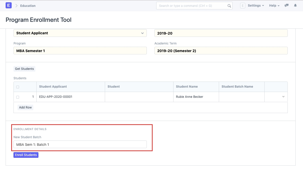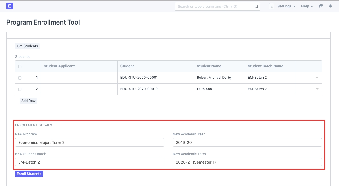 - Khi tất cả các chi tiết đã được nhập, hãy nhấp vào Đăng ký học sinh để tạo Đăng ký chương trình hàng loạt.  - Công cụ tuyển sinh sinh viên