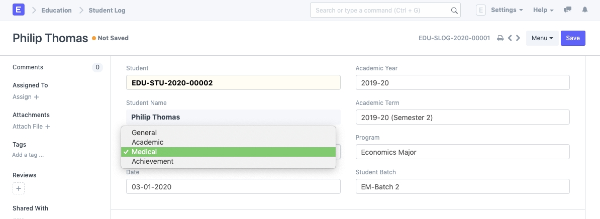• Loại : Bạn có thể nhập loại Nhật ký đang được tạo cho học sinh. Nhật ký học sinh có thể là nhật ký Tổng quát, Học thuật, Y tế hoặc Thành tích. Sau đây là một số ví dụ trong đó bạn có thể tạo nhật ký cho học sinh: